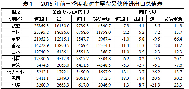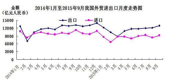 據(jù)海關(guān)統(tǒng)計,今年前三季度,我國進(jìn)出口總值17.87萬億元人民幣[ 經(jīng)國務(wù)院批準(zhǔn),自2015年1月起,全面發(fā)布以人民幣計價的海關(guān)統(tǒng)計數(shù)據(jù)。比去年同期(下同)下降7.9%。其中,出口10.24萬億元,下降1.8%;進(jìn)口7.63萬億元,下降15.1%;貿(mào)易順差2.61萬億元,擴(kuò)大82.1%。