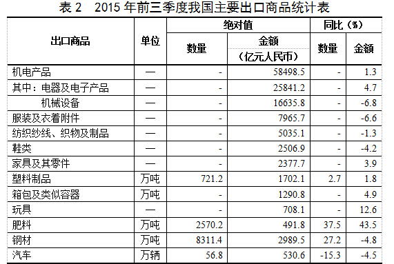 五、機(jī)電產(chǎn)品出口增長,傳統(tǒng)勞動密集型產(chǎn)品有所下降。前三季度,我國機(jī)電產(chǎn)品出口5.85萬億元,增長1.3%,占出口總值的57.1%。其中,電器及電子產(chǎn)品出口2.58萬億元,增長4.7%;機(jī)械設(shè)備1.66萬億元,下降6.8%。同期,服裝出口7965.7億元,下降6.6%;紡織品5035.1億元,下降1.3%;鞋類2506.9億元,下降4.2%;家具2377.7億元,增長3.9%;塑料制品1702.1億元,增長1.8%;箱包1290.8億元,增長4.9%;玩具708.1億元,增長12.6%;上述7大類勞動密集型產(chǎn)品合計出口2.16萬億元,下降2.2%,占出口總值的21.1%。此外,肥料出口2570.2萬噸,增加37.5%;鋼材8311.4萬噸,增加27.2%;汽車56.8萬輛,減少15.3%(表2)。