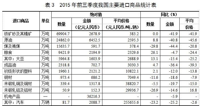 六、原油、糧食、成品油等主要大宗商品進(jìn)口量增加,煤、鋼材進(jìn)口量減少,主要進(jìn)口商品價格普遍下跌。前三季度,我國進(jìn)口鐵礦砂6.99億噸,與去年同期基本持平,進(jìn)口均價為每噸383.2元,下跌41.9%;原油2.49億噸,增加8.8%,進(jìn)口均價為每噸2595.3元,下跌45.6%;煤1.56億噸,減少29.8%,進(jìn)口均價為每噸378.4元,下跌20.8%;成品油2318.8萬噸,增加4.7%,進(jìn)口均價為每噸3030.3元,下跌39.3%;初級形狀的塑料1960.1萬噸,增加2.1%,進(jìn)口均價為每噸1.08萬元,下跌13.8%;鋼材973.4萬噸,減少11.6%,進(jìn)口均價為每噸7049.4元,下跌7.9%;未鍛軋銅及銅材339.4萬噸,減少5.5%,進(jìn)口均價為每噸3.88萬元,下跌15%。