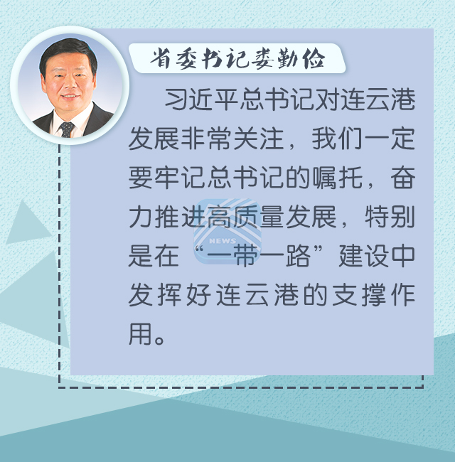 婁勤儉在聽取連云港工作匯報后說,連云港作為全國第一批對外開放的沿海港口城市,區(qū)位條件獨特,戰(zhàn)略地位重要,發(fā)展?jié)摿薮蟆A?xí)近平總書記對連云港發(fā)展非常關(guān)注,我們一定要牢記總書記的囑托,以習(xí)近平新時代中國特色社會主義思想為指導(dǎo),緊密結(jié)合實際貫徹好總書記一系列重要指示精神,認(rèn)真落實好省委十三屆三次全會部署,奮力推進(jìn)高質(zhì)量發(fā)展,特別是在“一帶一路”建設(shè)中發(fā)揮好連云港的支撐作用。